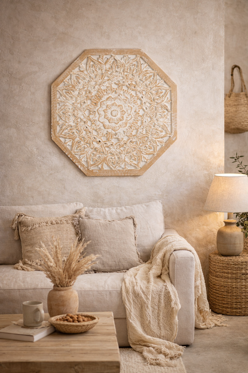 Διακοσμητικό τοίχου με απαλή ανάγλυφη υφή και φυσική απόχρωση, σχεδιασμένο να προσθέτει ζεστασιά και ισορροπία σε boho χώρους. Η ήρεμη γεωμετρία του δένει αρμονικά με φυσικά υλικά, υφές και γήινες παλέτες, δημιουργώντας έναν χαλαρό αλλά επιμελημένο χαρακτήρα στον χώρο.